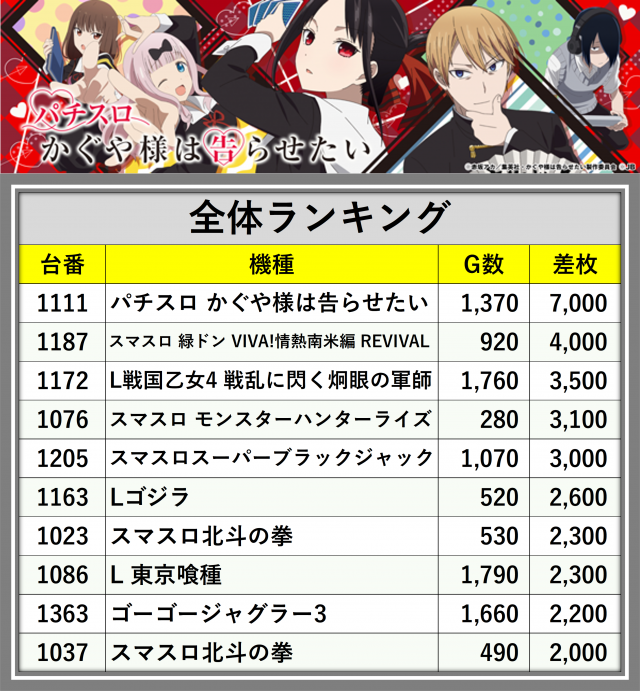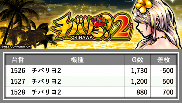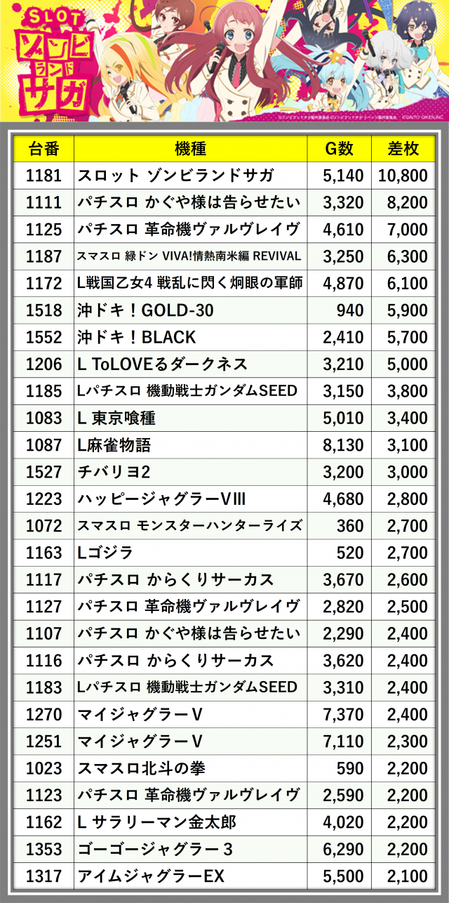 厳選された取材対象機種をはじめ、その他スロット全体から好記録が飛び出した!プレイヤーが楽しんだ1日を下記データにて振り返ってみて欲しい。