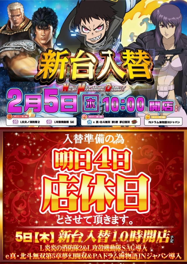 明日2月5日(木)新台入替! 朝10時開店!