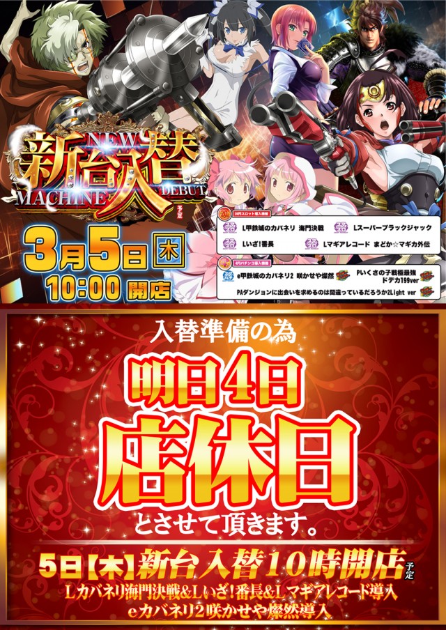 明日3月5日(木)新台入替! 朝10時開店!