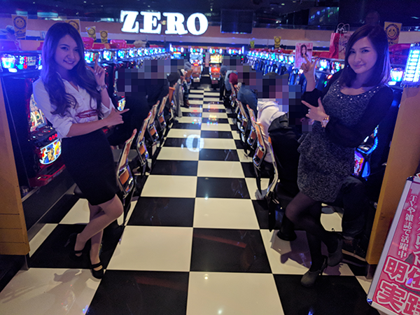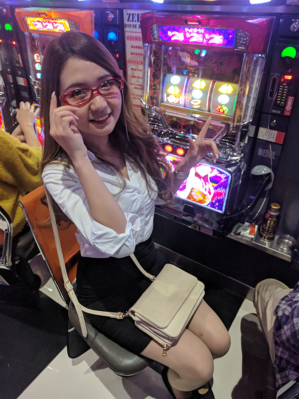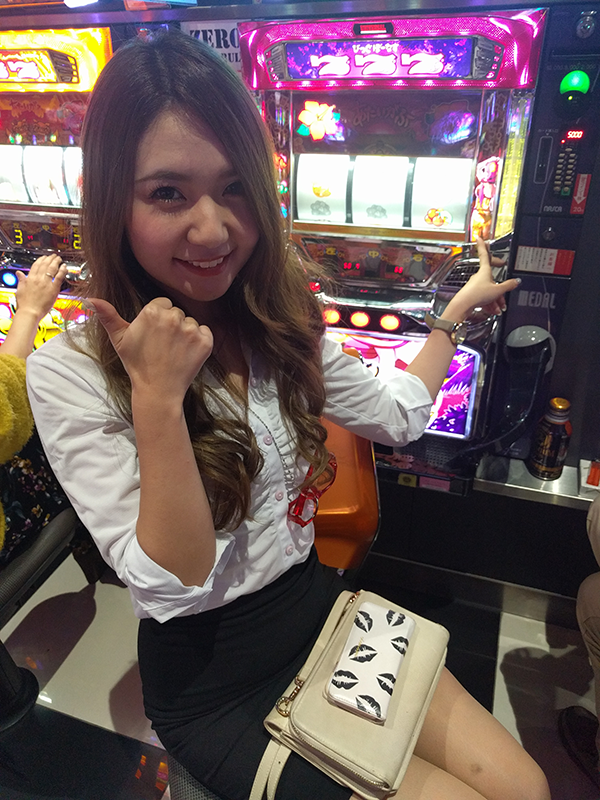 店内を見渡してみると……希依ちゃんも実戦している「沖ドキ」をはじめ、「バジリスク~甲賀忍法帖~絆」や「SLOT魔法少女まどか☆マギカ」、ゴッドシリーズが大好評! ほぼ満席という状況をキープしています。