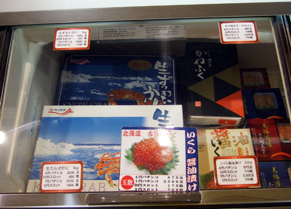 景品コーナーの品揃えも魅力的となっており、生ずわいがにや辛子明太子といった冷蔵食品も豊富に用意されていた。