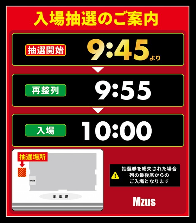 入場抽選:9:45開始、抽選場所:スロット側入口付近 |