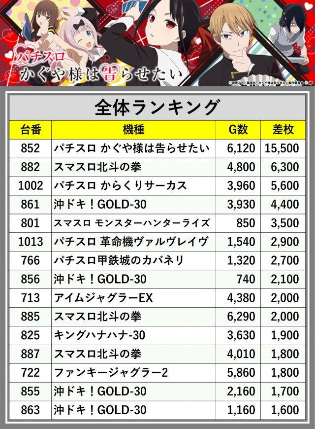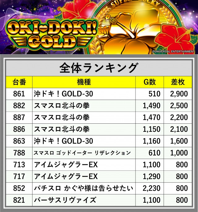 厳選された取材対象機種をはじめ、その他スロット全体から好記録が飛び出した!プレイヤーが楽しんだ1日を下記データにて振り返ってみて欲しい。