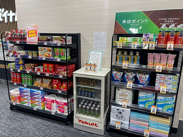 景品コーナーはドリンク類やお菓子、日用品など様々なアイテムが用意されていた。