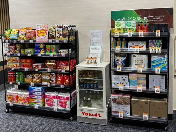 景品コーナーには日用品やお菓子など多彩なアイテムが並んでおり、プレイヤーたちの興味を引いていた。