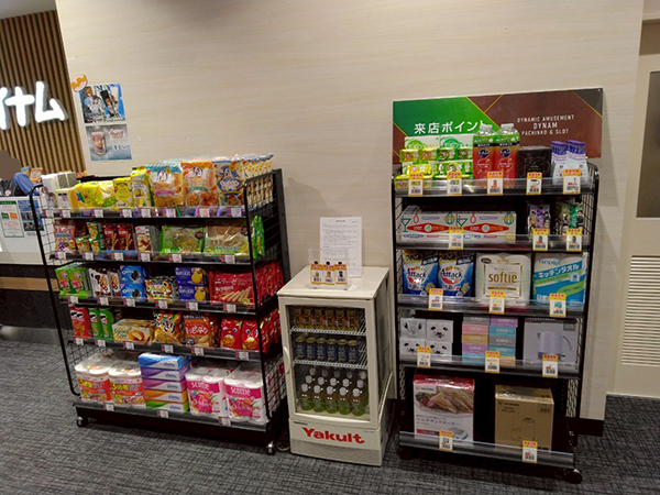景品コーナーにはたくさんのお菓子や来店ポイントで交換できるアイテムが用意されており、プレイヤーから好評だった。