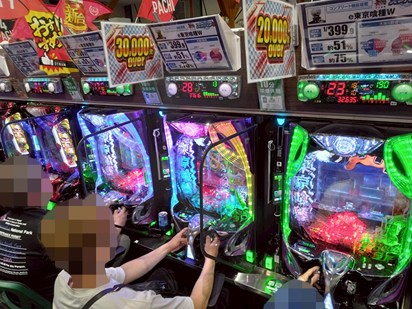14時ごろの4円パチンコを見渡すと「e 東京喰種」や「eぱちんこ押忍!番長 漢の頂」の盛り上がりが大きい。プレイヤーの活躍を各所で目にしている。