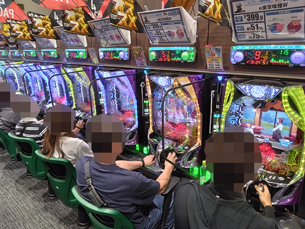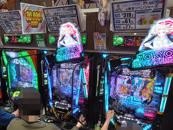 14時ごろの4円パチンコでは「e東京リベンジャーズ」や「e 東京喰種」が盛況の様子。機種のポテンシャルを上手く発揮するプレイヤーを多数確認している。