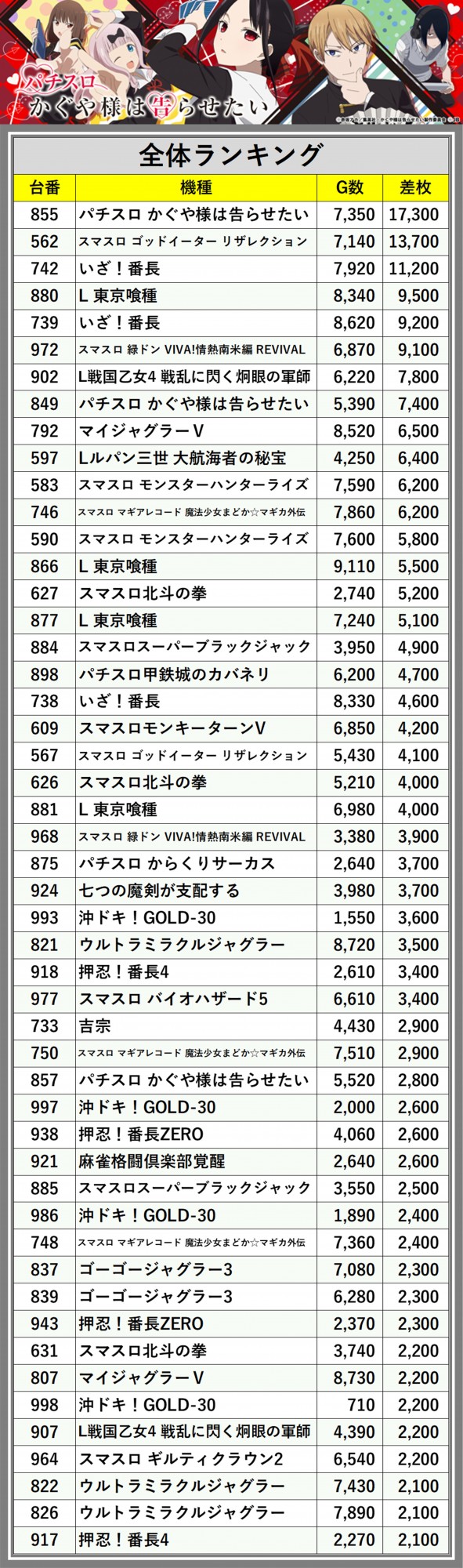 ※差枚数順に掲載しています