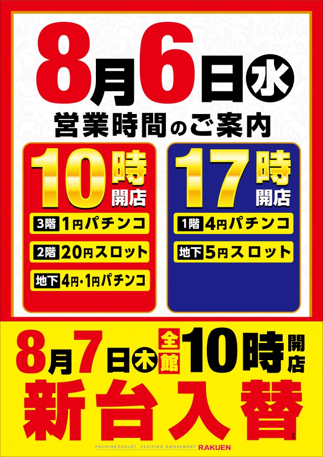 8月6日(水)楽園大宮店❗一部圧縮営業❗