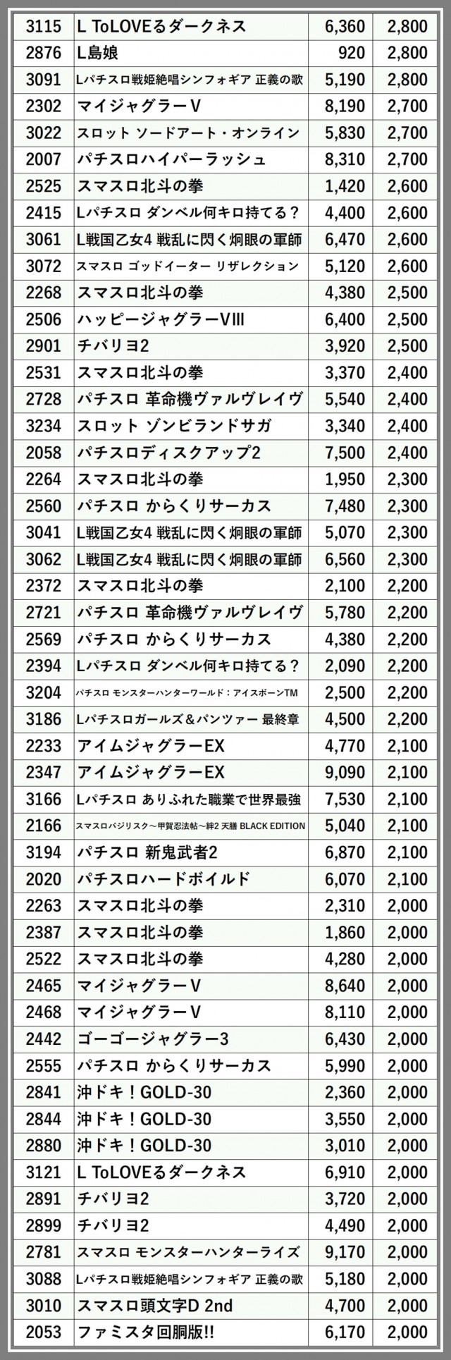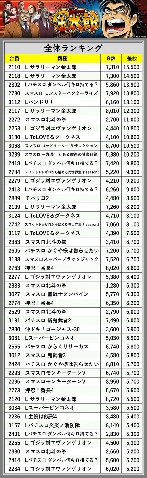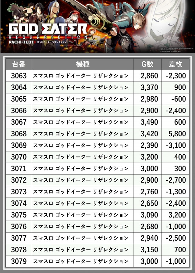 厳選された取材対象機種をはじめ、その他スロット全体から好記録が飛び出した!プレイヤーが楽しんだ1日を下記データにて振り返ってみて欲しい。