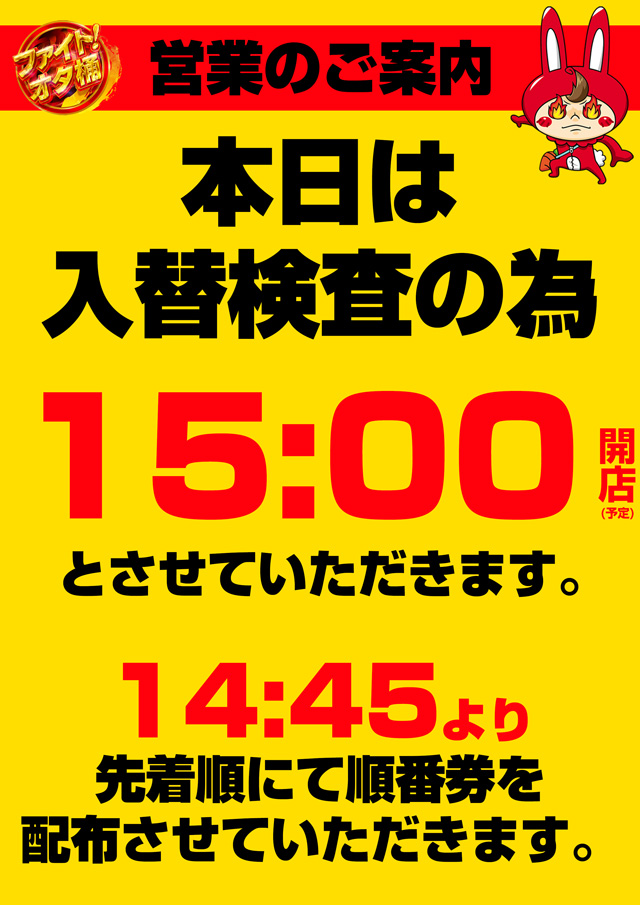 本日 2月5日(木)は、入替検査の為15時オープン!