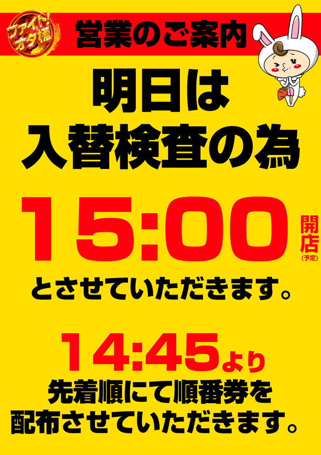 明日 2月5日(水)は、入替検査の為15時オープン!