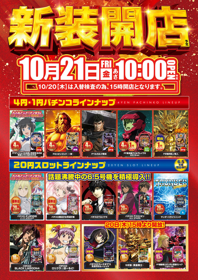 10月8日(土)リニューアルオープン 20円スロット増台!