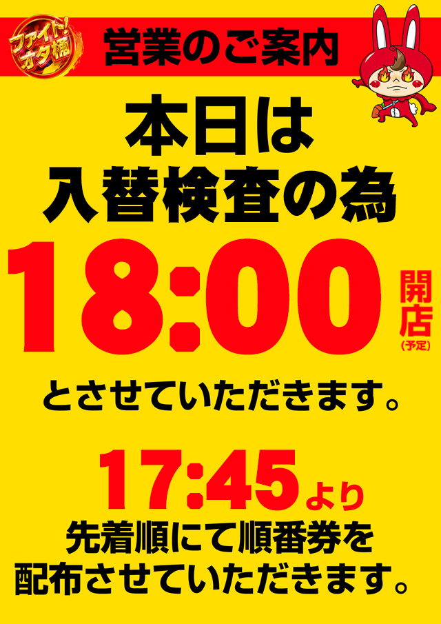 本日 6月6日(木)は、入替検査の為18時オープン!