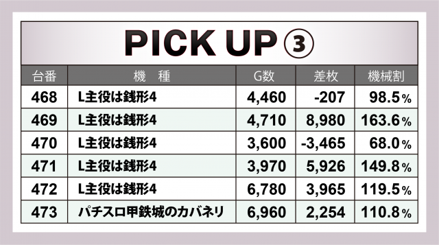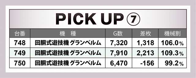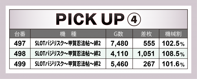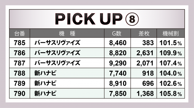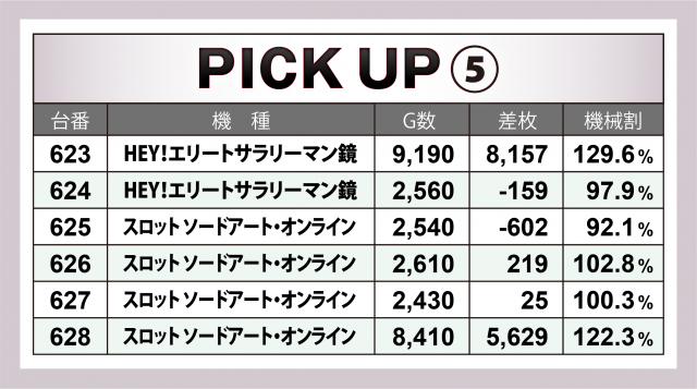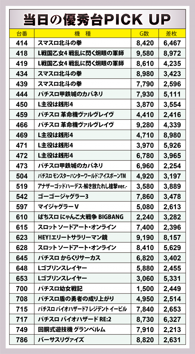 まずは当日の優秀30台PICK UPから。同店の取材では珍しいことではないが30台全てが+2千枚以上を達成、+3千枚以上は全体の3分の2弱となる19台、+4千枚オーバーは全体の3分の1強となる11台、+5千枚オーバーが9台、+6千枚オーバーが5台、+8千枚オーバーが3台と、今回もハイレベルをキープした。