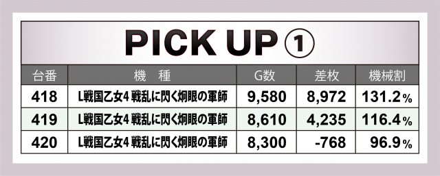 横並びでもスマスロ機の好調が目立ち、共に+8千9百枚弱をマークした『L戦国乙女4 戦乱に閃く炯眼の軍師』『L主役は銭形4』、+8千1百枚を突破した『HEY!エリートサラリーマン鏡』と、いずれも+8千枚超えのハイクオリティを誇った。また、『戦国乙女4』では+4千2百枚超、『銭形4』では+6千枚弱&+4千枚弱と、ハイスコア台が乱舞した。