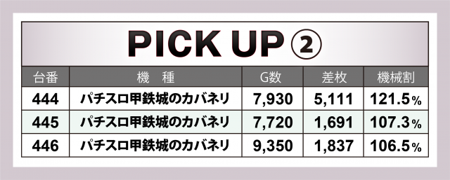 以下からは[1000円/46枚]スロ400台の出玉データをチェックし、この日の優秀台に追っていこう。