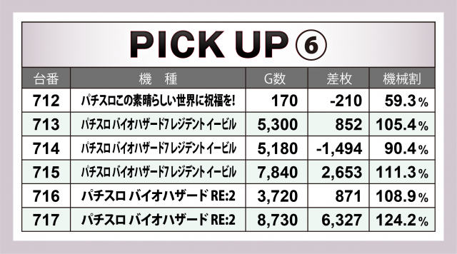 その他の差枚数上位を順に挙げると、+6千3百枚を超えた『パチスロ バイオハザード RE:2』、+5千6百枚超となった『スロット ソードアート・オンライン』、+5千1百枚超をトップに4台の合計で+1万1千枚弱を記録した『パチスロ甲鉄城のカバネリ』、さらに+2千枚超の台が複数見受けられた。