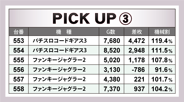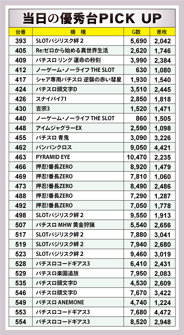 優秀台を見てみると、+4,472枚の『パチスロコードギアス 反逆のルルーシュ3』553番台を筆頭に多彩な機種が活躍。+4,421枚の『バンバンクロス』462番台、+3,422枚の『パチスロ頭文字D』546番台、+3,226枚の『パチスロ 青鬼』455番台、+3,041枚の『SLOTバジリスク〜甲賀忍法帖〜絆2』517番台などが盛り上がりを見せていた。