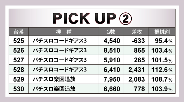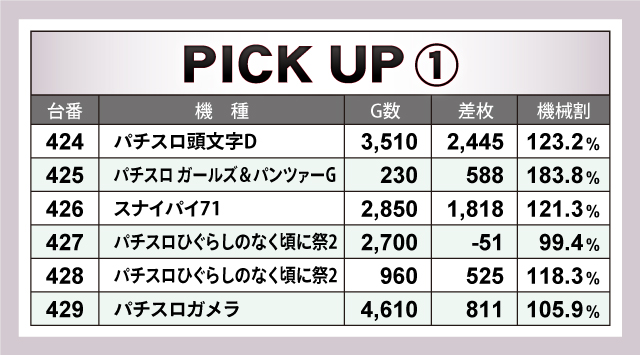 ピックアップ機種では、『パチスロひぐらしのなく頃に祭2』、『パチスロコードギアス 反逆のルルーシュ3』、『パチスロ楽園追放』、『ファンキージャグラー2』、『パチスロ七つの大罪』などが、並びで活躍台を送り出していた。