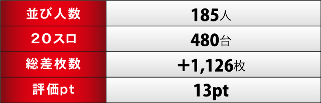 優秀台、ピックアップ機種の活躍もあって、パチスロ全体では、+1,126枚を記録。評価ptも13ptを獲得した。盛り上がりっぷりからするとやや物足りない気もするが、これで3連勝をマーク。今後も期待できる一日となった。