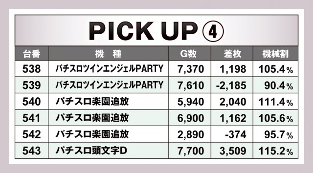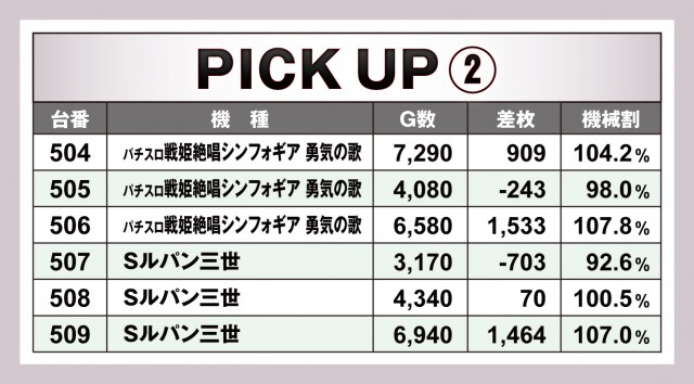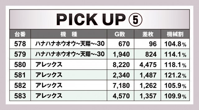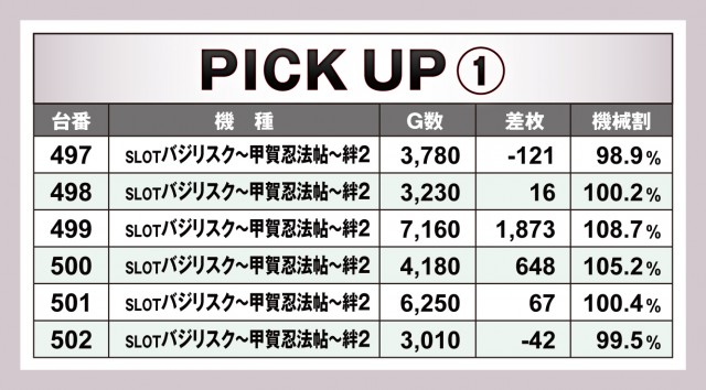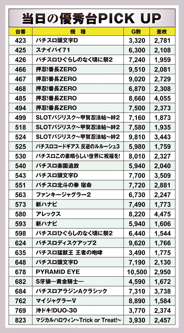 前回は『押忍!番長ZERO』が優秀台多数となっていたが、今回は『SLOTバジリスク~甲賀忍法帖~絆2』からも複数台出てきていることから、やはり人気機種の待遇は〇と言ったところか。それ以外ではサミー系AT機と技術介入系のボーナス+RTの機種から2000枚弱~4000枚弱の差枚数の台が多数! そして、当ホールならではのと言えばいいのだろうか。この「英雄の軌跡~ヒーローズレポート~」では毎回『PYRAMID EYE』に優秀台があるのを見逃してはならない。