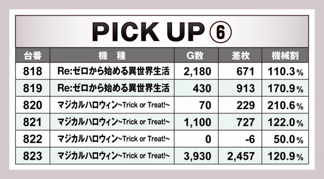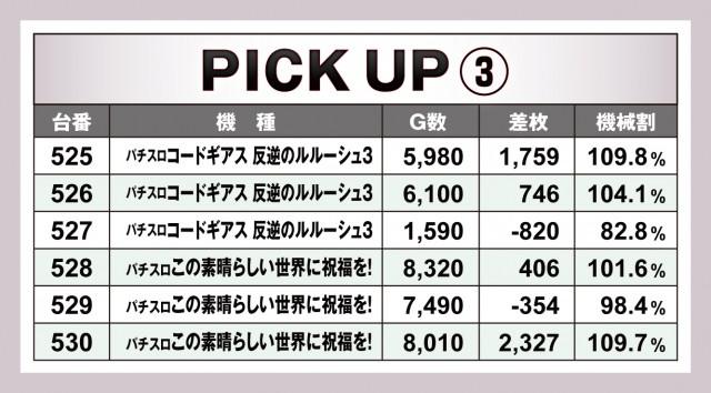 今回のピックアップは6箇所。「バジ絆2」や「番長ZERO」の2大巨頭がある中で、とりわけサミー系AT機には注目せざるをえない。『パチスロ コードギアス反逆のルルーシュ3』『パチスロこの素晴らしい世界に祝福を!』『パチスロ楽園追放』『パチスロ頭文字D』など、2大巨頭よりも台数は少ないが、3台~8台機種でもチャンスあり。昨今のサミー系AT機の高設定は出玉性能抜群なので、ここらあたりも狙い目と言えるのではないだろうか。