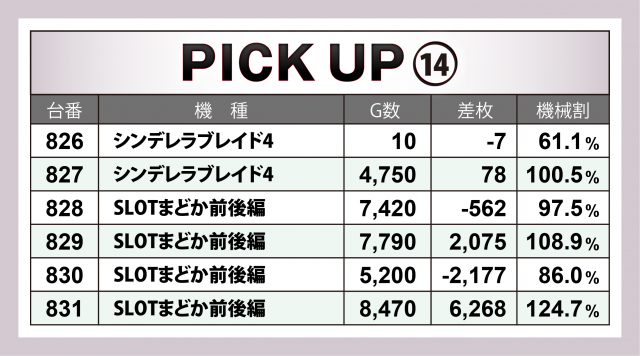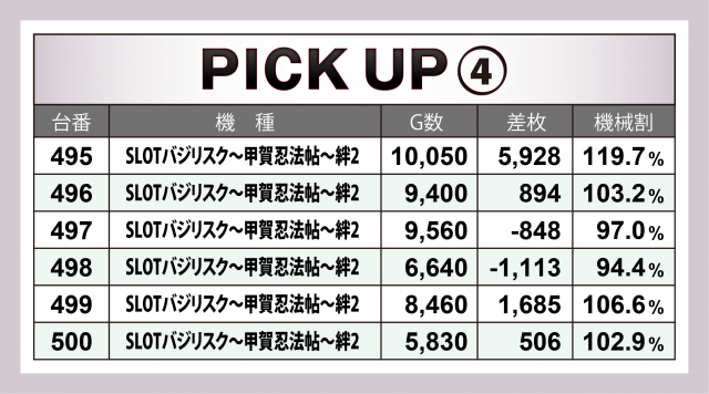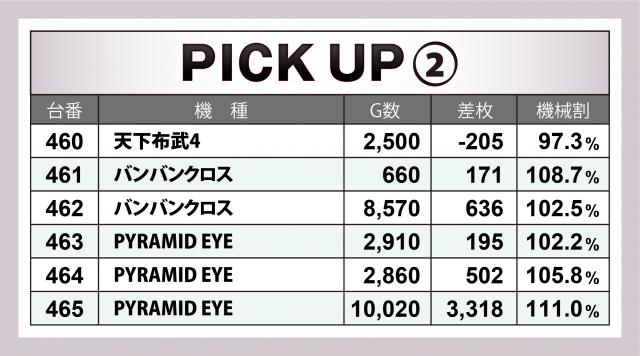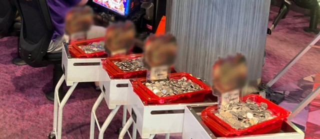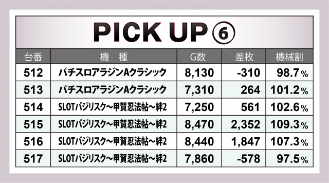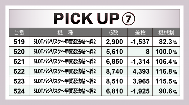 そして驚くことに当日は横並び好況スポットが全14か所、6台ずつ全84台が対象に。稼働数が少ない台や突出した出玉がない6台並びも見られたが、+6千~5千枚クラス4台、+3千枚クラス6台を輩出する結果となった。