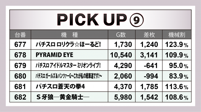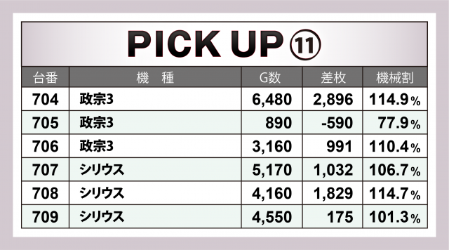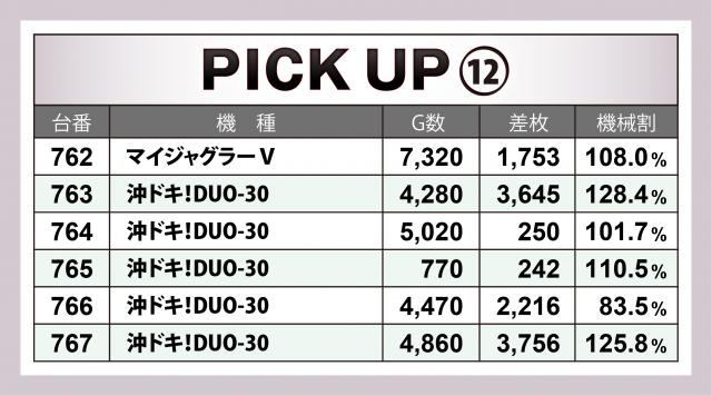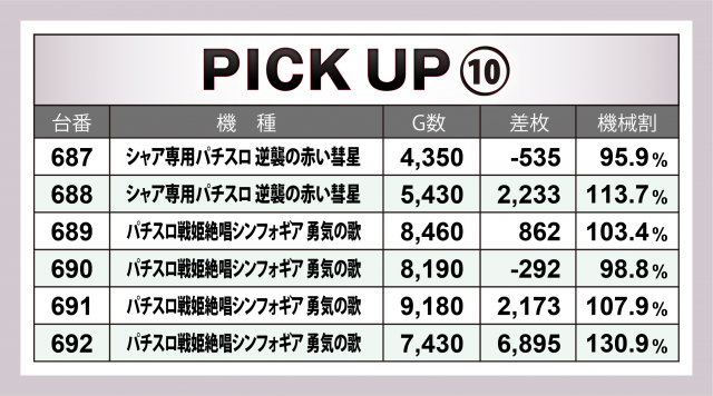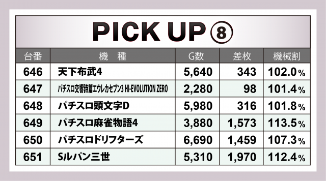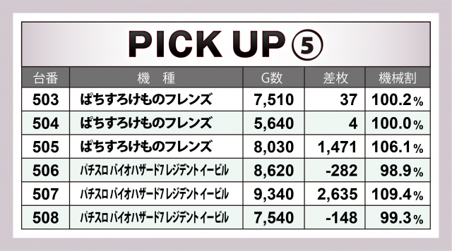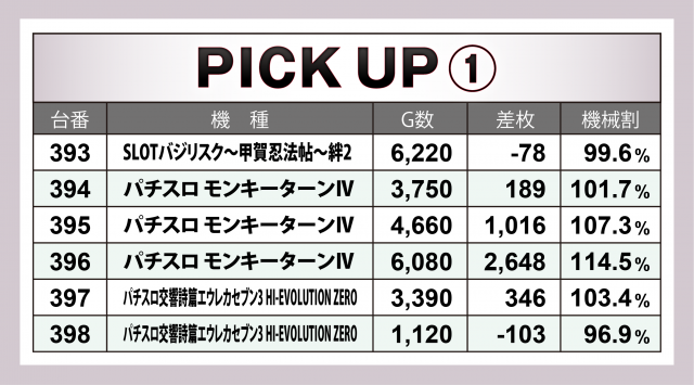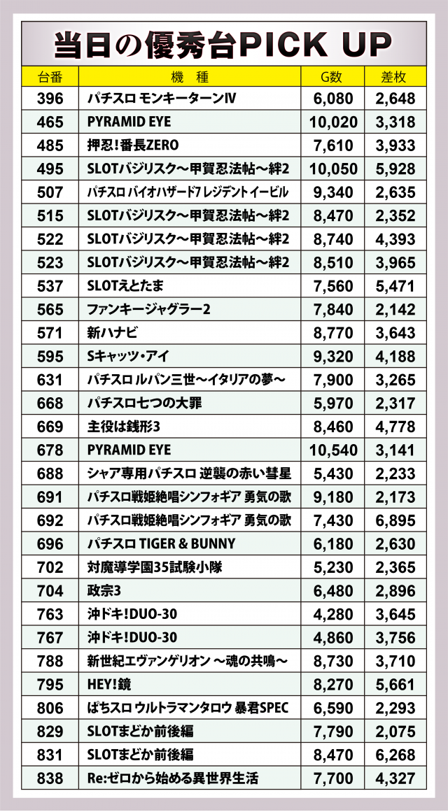まずは優秀30台のPICK UPから。この日は30台全てが差枚数+2千枚以上を達成、+5千枚以上は5台となった。後述する横並び好況スポット以外では『SLOTえとたま』『主役は銭形3』が+5千枚超えorそれに迫るハイスコアが光った。