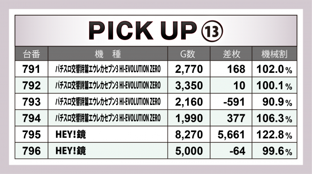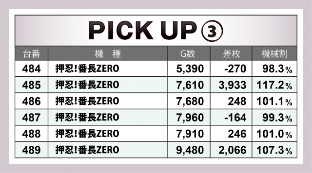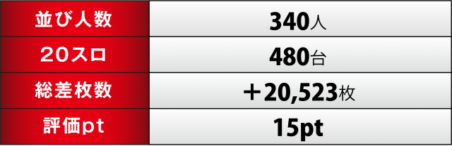 この日[1000円/46枚] スロ全480台は、トータル差枚数+20,523枚&評価pt15と安定の記録を残した。とは言え、前述した通り横並び好況スポットの中では稼働ゲーム数の少ない台も見られ、まだまだプラス差枚数を広げることができたかもしれない。まだまだ伸びしろがあるということで、次回の「英雄」取材ではさらなる高みに期待したい。