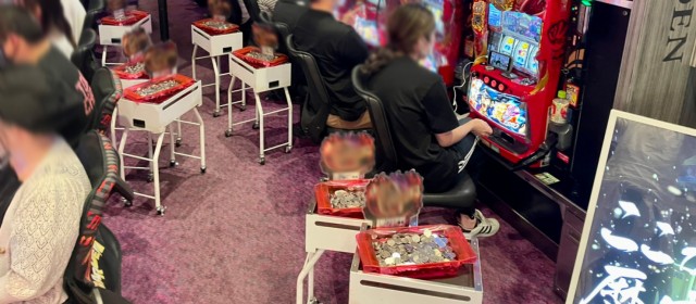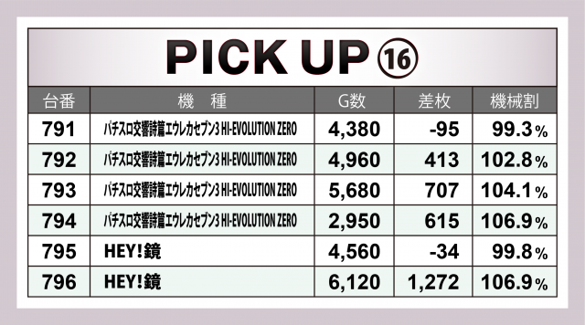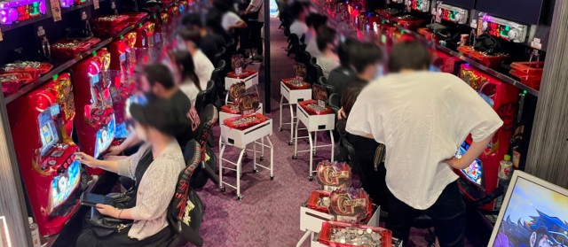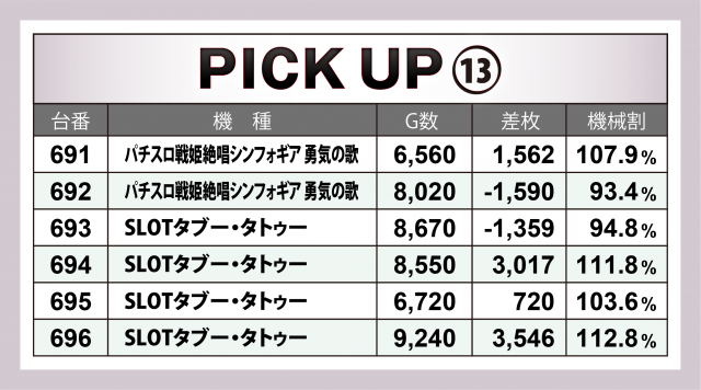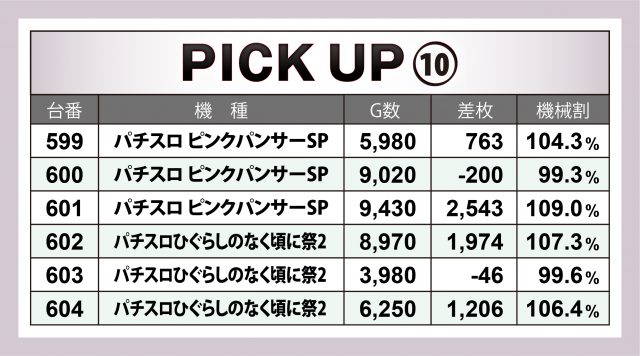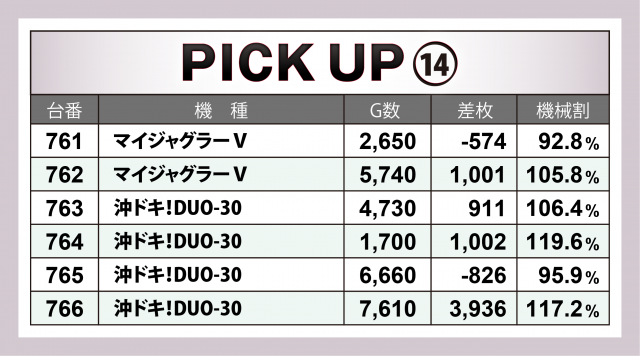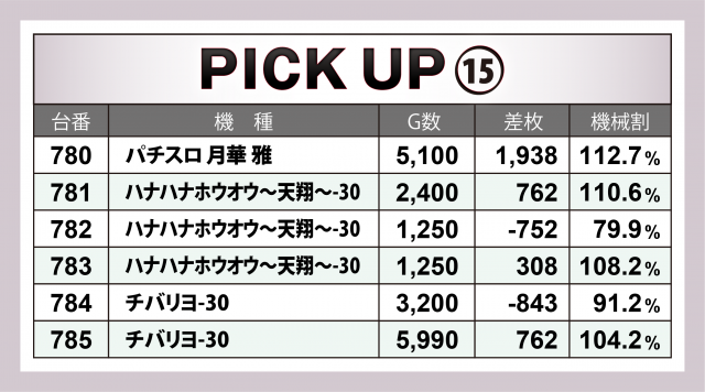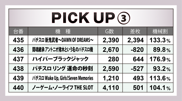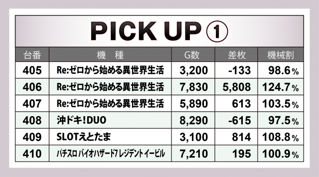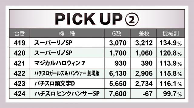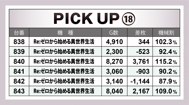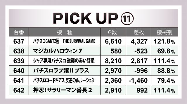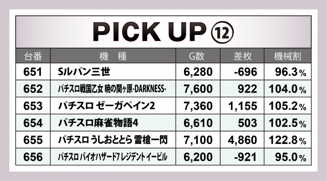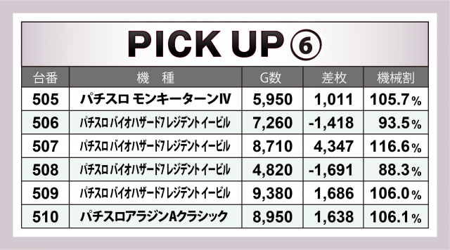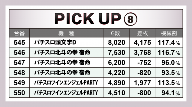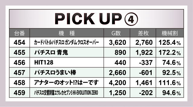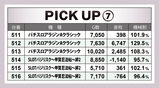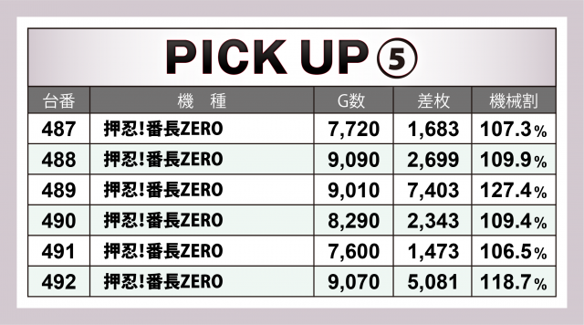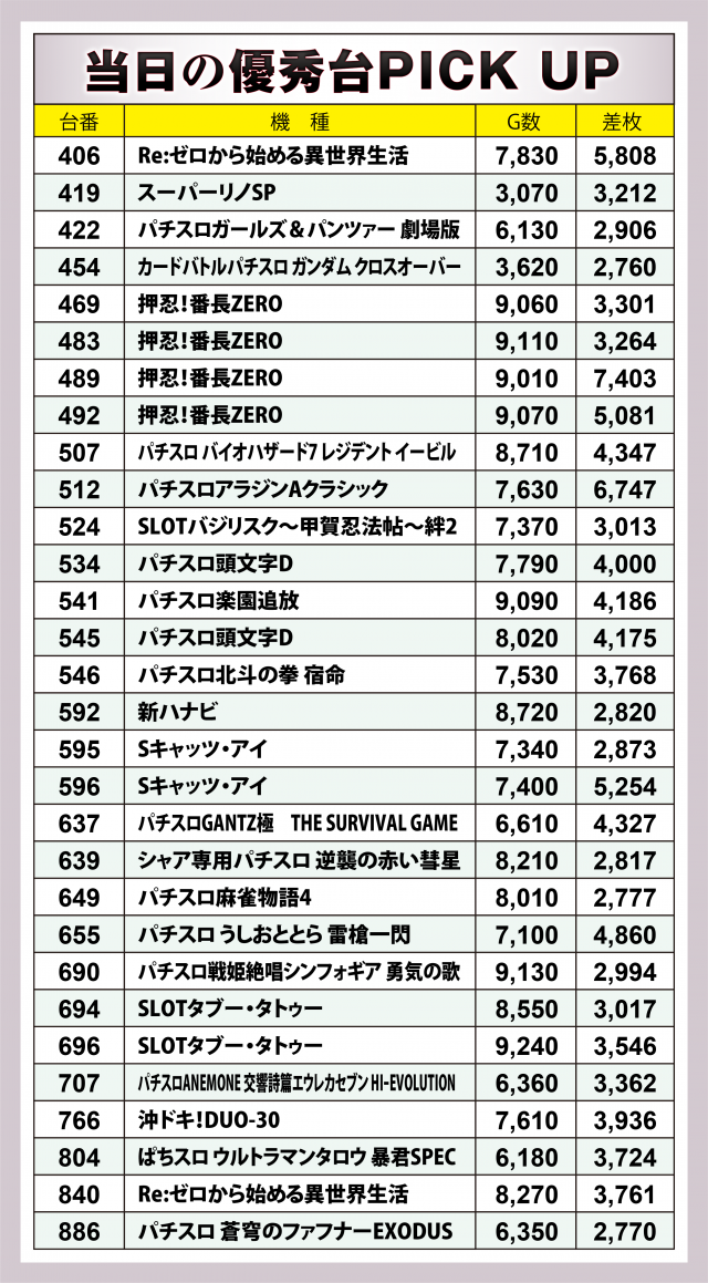 そして、さらなるサプライズあり! 前回の横並び好況スポット全14か所全84台を超えて、今回は18か所全108台が対象に。前回に比べ稼働数が少ない箇所はあまり見られず、+7千枚超が1台・+6千枚超が1台・+5千枚超が3台・+4千枚超が4台・+3千枚超が7台という結果となった。特に『押忍!番長ZERO』のシマは後ろ積み連発で、お祭り騒ぎ!