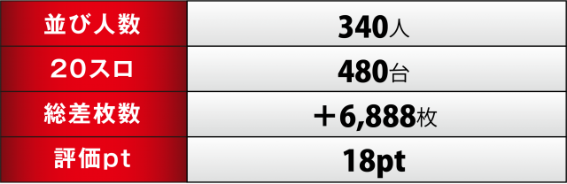 この日[1000円/46枚] スロ全480台は、トータル差枚数+6,888枚という結果に終わった。上の派手な出玉データからは若干物足りない合計数となったが、つまりはマイナス台の合計もそれなりに大きかったということ。マイナス台を避けることさえできれば、同店の「英雄」取材ではビックヒットが期待できそうだ。また評価ptも前回より3上昇、次回もプラスで2ケタ台の連勝実現が期待できそうだ。