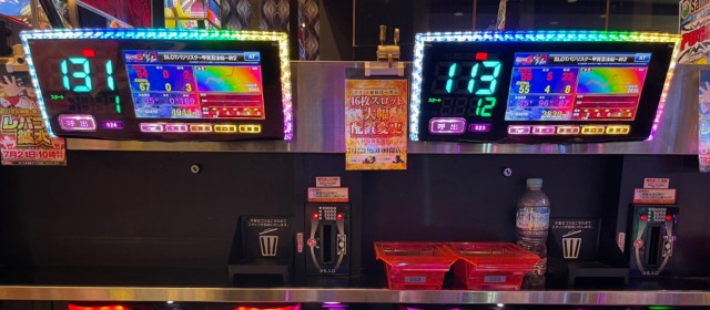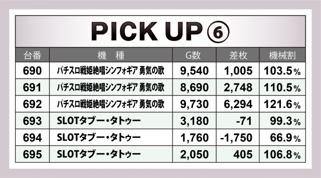 続いては8箇所6台ずつ計48台の横並び好況スポットについて。マイナス台が多少あるものの全体的に好調な差枚数を刻み、ドル箱の量やボーナス回数で目立ったのは『Sキャッツ・アイ』『パチスロ ピンクパンサーSP』『パチスロ戦姫絶唱シンフォギア 勇気の歌』で、特に『シンフォギア』は+6千枚台が出現!