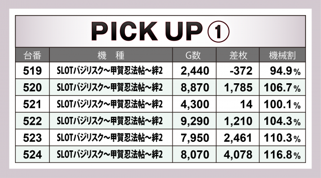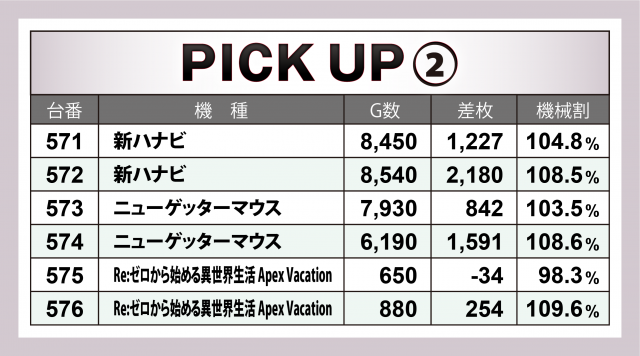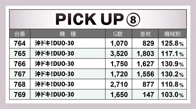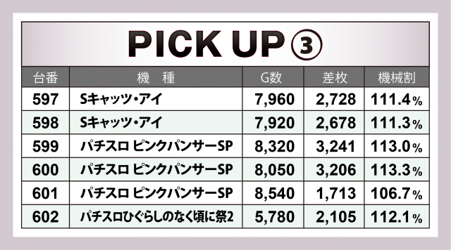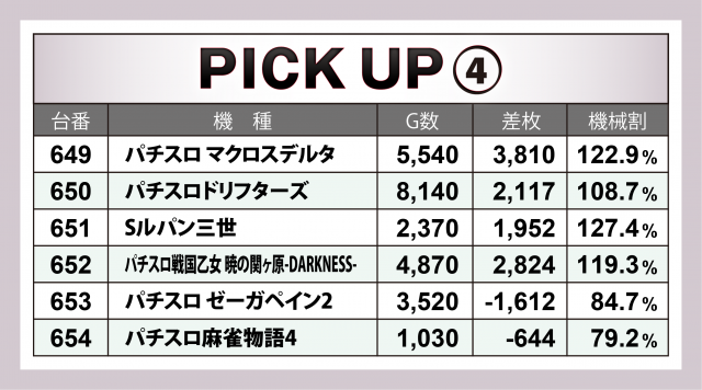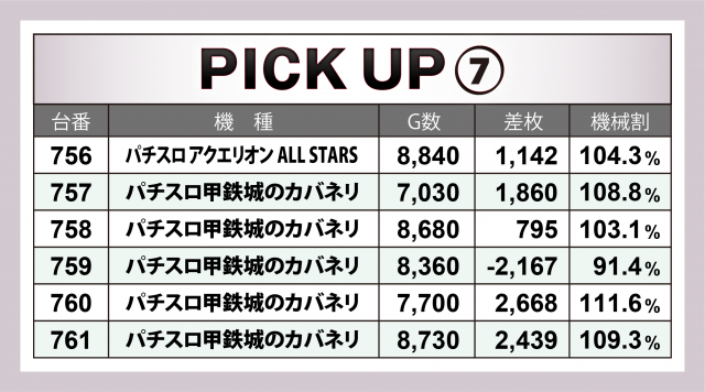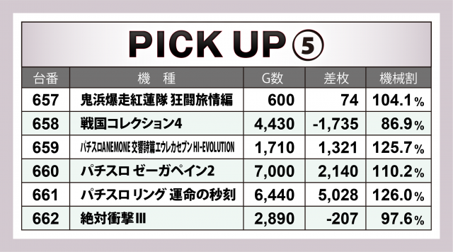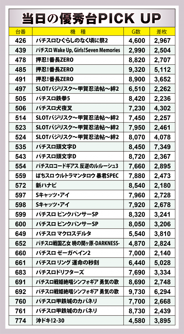 まずは優秀30台のPICK UPから。この日は30台全てが差枚数+2千枚以上、+3千枚以上が12台、+4千枚以上が6台となった。後述する横並び好況スポット以外では、3台トータルで+1万1千枚を記録した『押忍!番長ZERO』、+7千枚オーバー台を輩出した『パチスロ頭文字D』、その他では6.5号機の台頭が目に付いた。