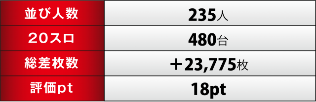この日[1000円/46枚] スロ全480台は、トータル差枚数+23,755枚と前回を上回る好成績で終了。また評価ptも前回と同じ数値となり高水準を維持。トータルプラス10連勝を成し遂げた同店、次回以降の取材でもハイスコアが期待できること間違いなし!?