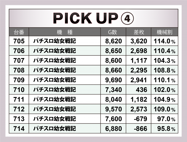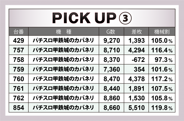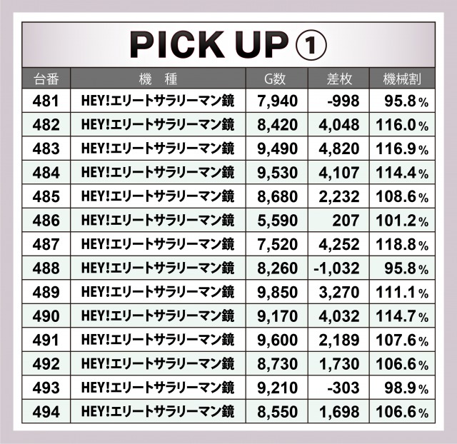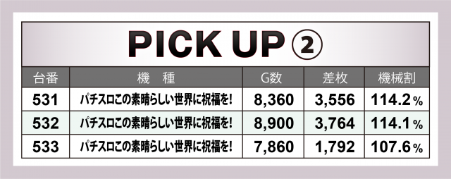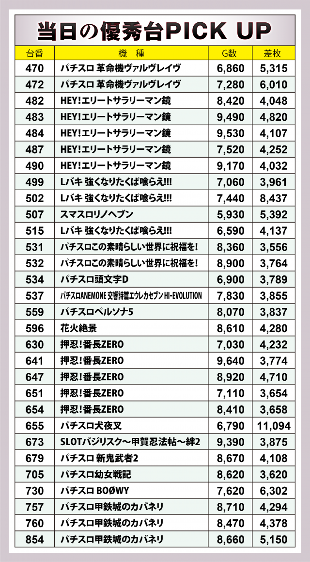 続いては当日好調だった5機種計39台について。まずは14台横並び対象で合計が+3万枚を超えた『HEY!エリートサラリーマン鏡』から。+4千枚突破が5台も! その他、+5千枚×1・+4千枚×2で8台トータルで+1万8千枚を記録した『パチスロ甲鉄城のカバネリ』、さらには『パチスロこの素晴らしい世界に祝福を!』『パチスロ幼女戦記』『パチスロ 新鬼武者2』も軒並み好成績を叩き出した。