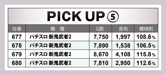 まずは優秀30台のPICK UPから。30台全てが差枚数+3千枚以上という快挙を達成! +4千枚以上は20台、+5千枚オーバーは7台、+6千枚オーバーは4台となった。後述する好調5機種以外では、なんと言っても+1万1千枚を突破した『パチスロ犬夜叉』が見逃せない。その他、+8千枚をトップに2台で+1万2千枚をクリアした『Lバキ 強くなりたくば喰らえ!!!』、+6千枚超を記録した『パチスロ BOØWY』、+5千枚オーバーをマークした『スマスロリノヘブン』のハイスコアが目立つ結果に。