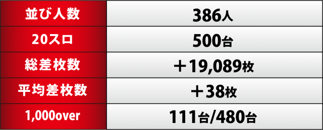 前回は10月に実施、今回2ヵ月ぶりに「ヒーローズレポート」が繰り広げられた「埼玉県某店」。2022年最後の取材となり、現在トータルプラス15連勝中の記録を誇る驚異の店舗だ。年末ということもあり、400人近いファンが開店を待ちわび、ぱちタウンからオモダたくみがスペシャルレポーターとして朝イチの並びに加わる中、気になる結果は…上表の通り、厳しいと言われる時期にありながら+2万枚近い差枚数を残して白星継続! 以下からは[1000円/46枚] スロ全480台の詳細出玉データと共に、当日の模様を振り返っていこう。