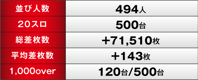 前回は+4万枚超えの大勝利で終わった『埼玉県某店』の「ヒーローズレポート」。今回3月28日の実施では、朝から足を運んだファンは494人と、大きな期待を寄せているファン達が多くいることが窺えた。そして気になる結果は…上記の通り、71,510枚のプラス差枚で終了! 大満足の結果となった。以下からは、当日の出玉データを振り返っていこう。