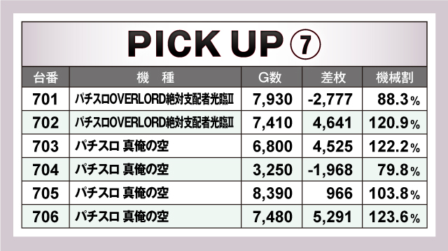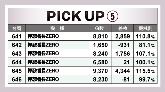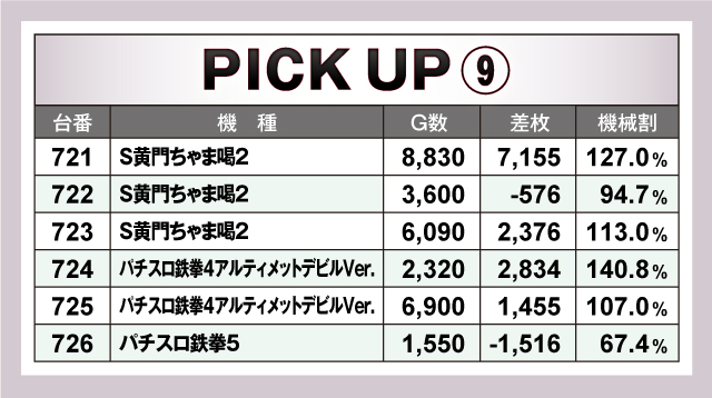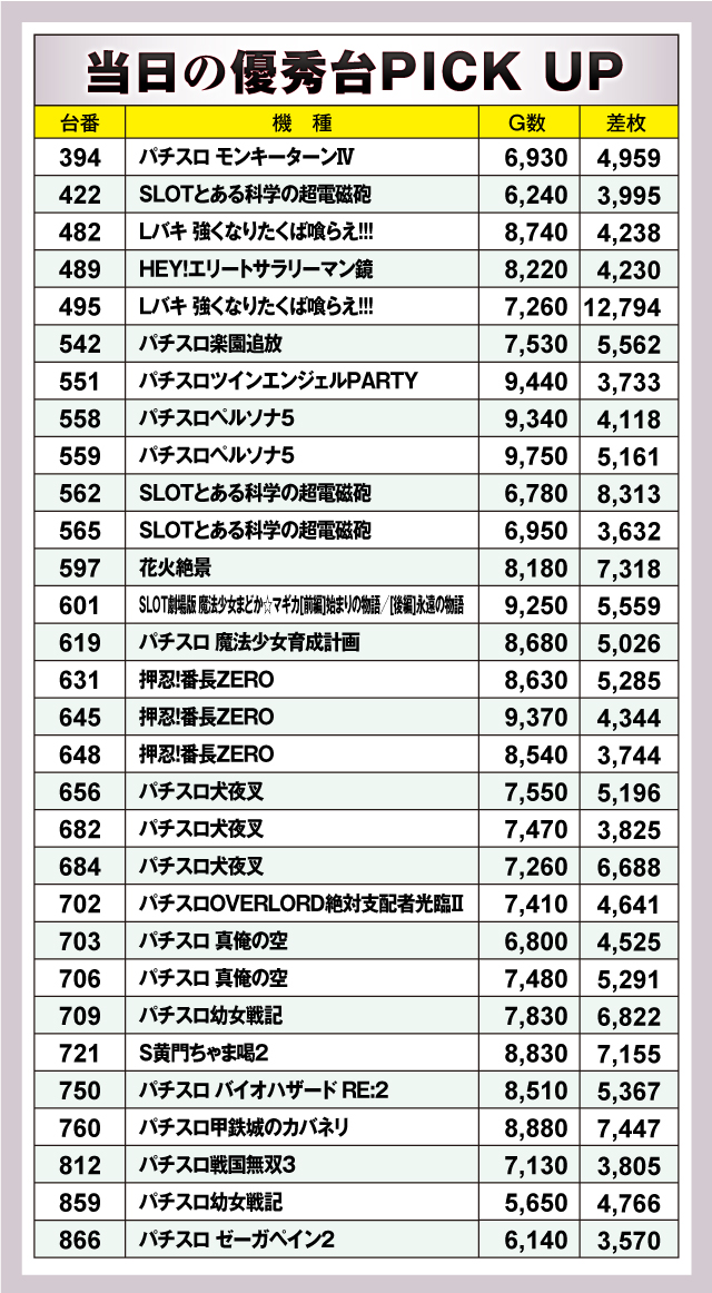まずは優秀30台のPICK UPから。幅広い機種が優秀台に名を連ねており、30台すべてが3,000枚オーバーと絶好調で、最高記録は495番台の「Lバキ 強くなりたくば喰らえ!!!」の+12,794枚という素晴らしい結果に。その他+5,000枚を超える台も半数の15/30台と、店内のアチコチに良台を確認できた!