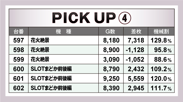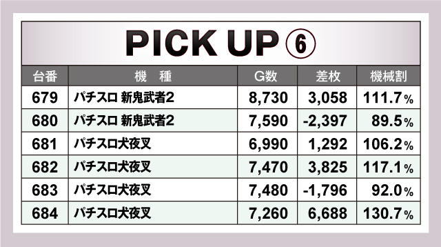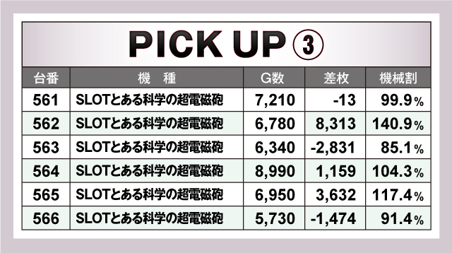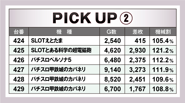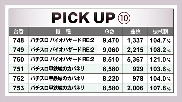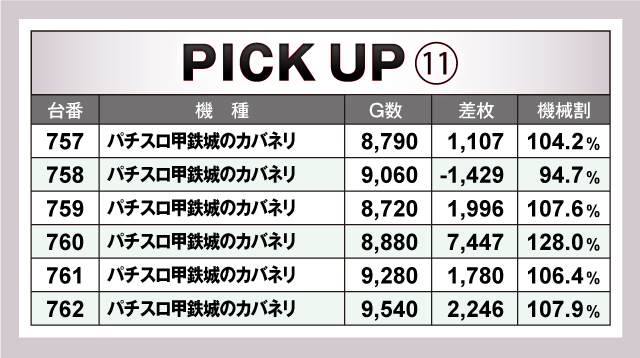 続いては6台並びで好調だった11箇所について。どの箇所もトータルプラスだったが、とくに「パチスロ甲鉄城のカバネリ」の6台並びは、5/6台がプラスの平均+2,000枚超えの良結果に。その他の並びも素晴らしく、この日の傾向は並びにチャンスが投入されていたので、次回実施時もチェックしよう!