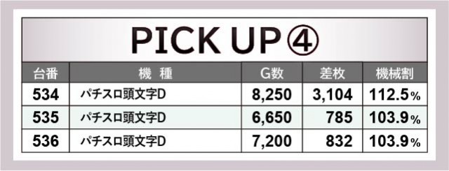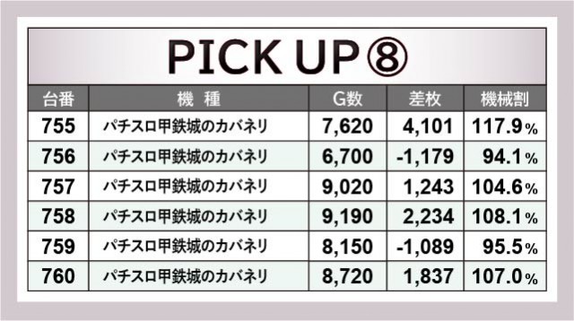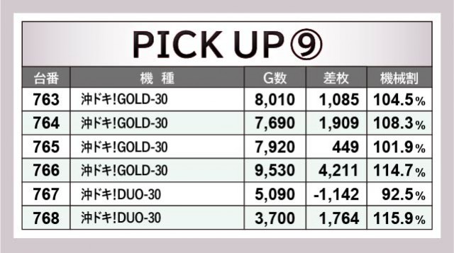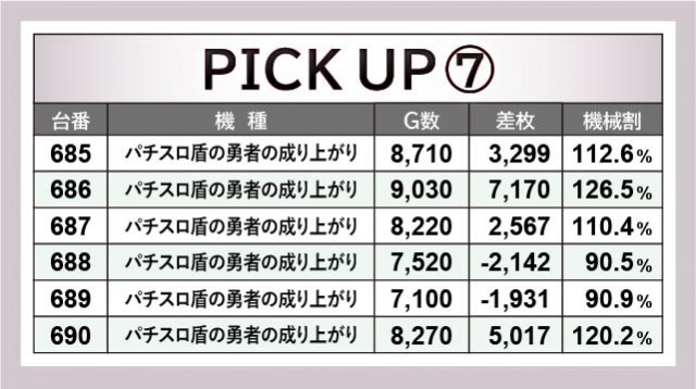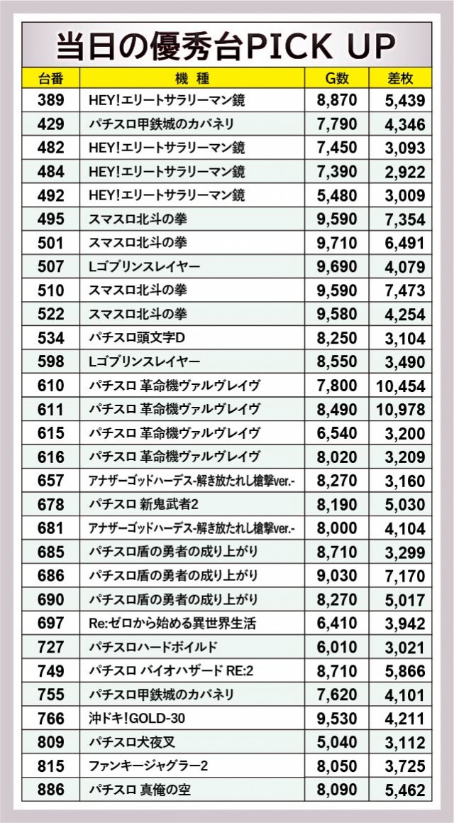 『パチスロ盾の勇者の成り上がり』686番台+7,170枚という大きな記録が生まれれば、『パチスロ甲鉄城のカバネリ』755番台+4,101枚や『沖ドキ!GOLD-30』766番台+4,211枚など、各所で大きな熱気を確認できる。いずれの機種も多くのゲーム数が消化されているため、もはや言葉にする必要はないだろう。しっかりと可能性を見極め、閉店まで遊技していたファンは有意義な時間を過ごしていたに違いない。