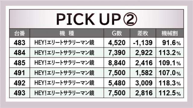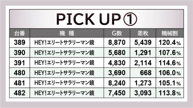 『スマスロ北斗の拳』から501番台+6,491枚が発生しており、6台横並びで盛り上がる同機種を牽引する存在となっていた。また同じくスマスロから『HEY!エリートサラリーマン鏡』は、12台が活躍していた様子が見受けられる。389番台+5,439枚といった大きな熱を放ち、安定感のあるグラフを描いていたのが印象的だ。