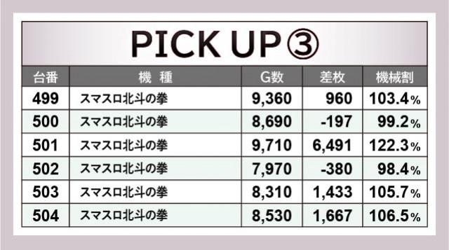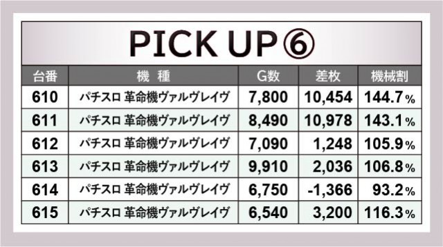 『パチスロ 革命機ヴァルヴレイヴ』610番台+10,454枚・611番台+10,978枚と、大人気のスマスロが2台横並びで万枚OVERを達成するという偉業を成し遂げた。ほかにも、『スマスロ北斗の拳』495番台+7,354枚・510番台+7,473枚や『パチスロ盾の勇者の成り上がり』686番台+7,170枚など、大台突破台を確認できたのも好感を覚えるばかり。また回転数に着目すれば、いずれも多くのゲーム数が消化されているため、誰もが実りある時間を過ごしていたと想像できる。