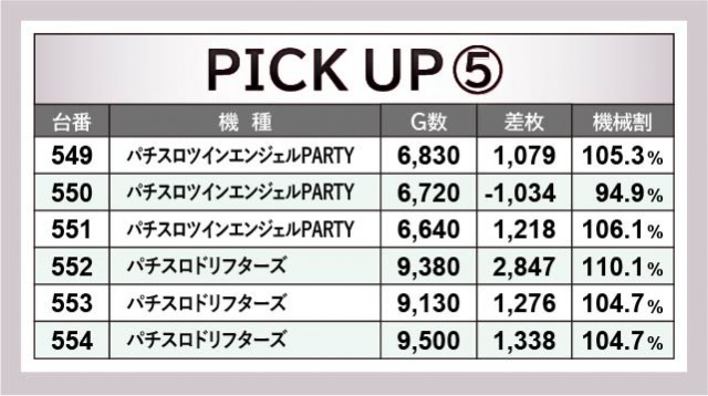 『パチスロ頭文字D』『パチスロツインエンジェルPARTY』『パチスロドリフターズ』の3機種は、活気づいていたのが強い印象を受ける。それどころか、『パチスロドリフターズ』は全員がドル箱に手を伸ばしており、明らかな好感触に笑顔を覗かせていたことだろう。また前述したように、『パチスロ 革命機ヴァルヴレイヴ』は2台の万枚OVERが発生する大盛況ぶりを披露。全体的に多くのゲーム数が消化されているため、こちらでもレバーを力強く叩く光景が容易に想像できる。