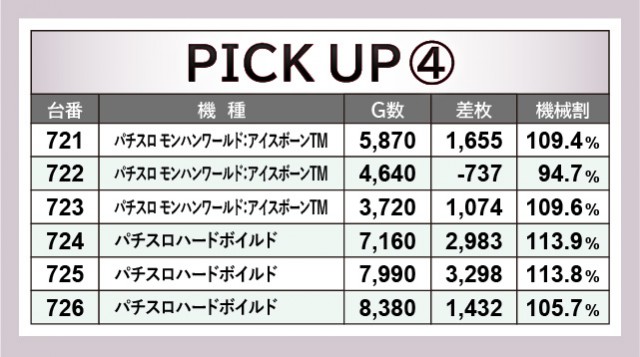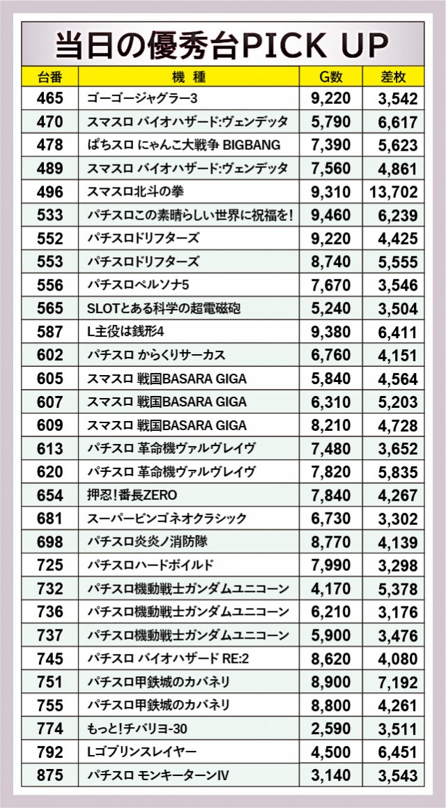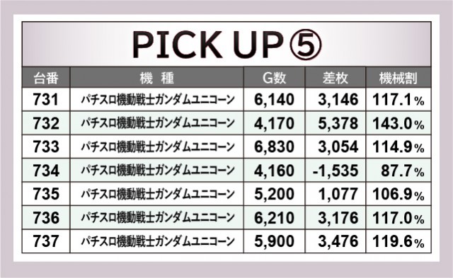 『スーパービンゴネオクラシック』は2台の3千枚OVER台が生まれ、『パチスロハードボイルド』また同様の熱気を放っていた。それ以上に活躍したのが『パチスロ機動戦士ガンダムユニコーン』で、732番台+5,378枚を筆頭に4台の3千枚OVER台が発生。まとまりのある内容が特徴的で、多くのファンが熱い視線を向けていたことだろう。