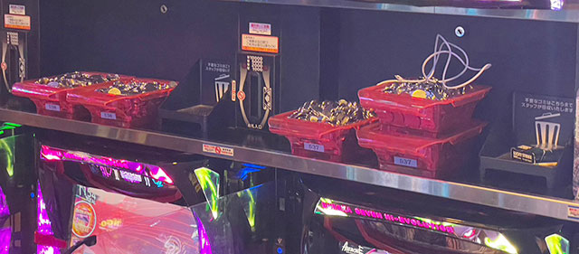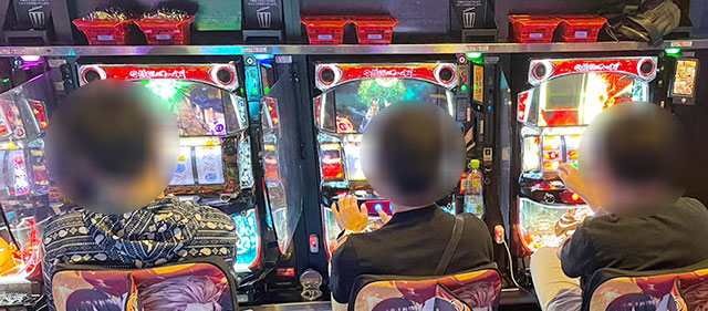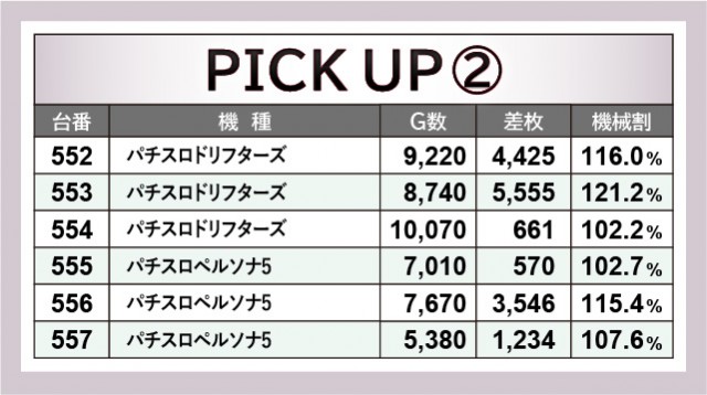 『パチスロドリフターズ』3台はいずれも活気と熱気に満ちており、553番台+5,555枚という数字から、盛り上がりを牽引する存在となっていた。『パチスロ楽園追放』542番台+3,171枚や『パチスロペルソナ5』556番台+3,546枚という数字も目立っており、スマスロに負けない熱気と活気を披露していた機種群だ。