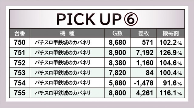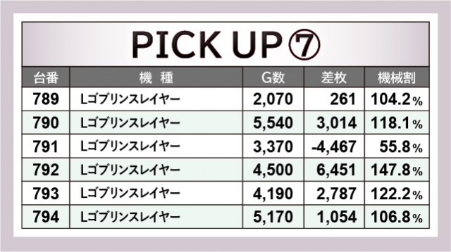 人気機種『パチスロ甲鉄城のカバネリ』751番台+7,192枚という大きな数字を確認でき、さらには755番台+4,261枚という結果も目立っている。回転数から鑑みても、ファンは相当な手応えを感じていたのは明らかだ。また『Lゴブリンスレイヤー』も792番台+6,451枚という熱気を放ち、同機種らしいポテンシャルを発揮していたのも見逃せない。