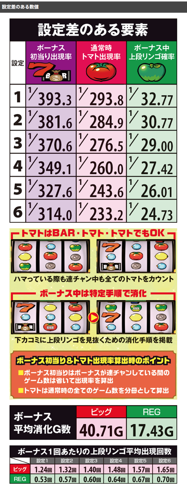 ボーナス中の上段リンゴ確率にも設定差がある。カウントするための消化手順を実行し、正確にサンプルを集めたい。ボーナスのゲーム数が固定ではないといったポイントに注意しよう。